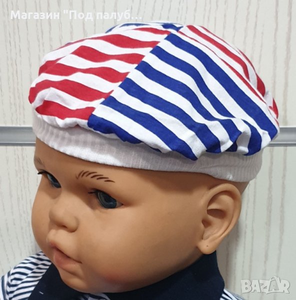 Нова удобна шапка тип барета в бебешки размери на червено, синьо и бяло райе. Може да се носи както самостоятелно, така и като допълнителен моряшки аксесоар към морски тоалет. Прекрасен морски сувенир или подарък от морето. Материал: 100 % памук.