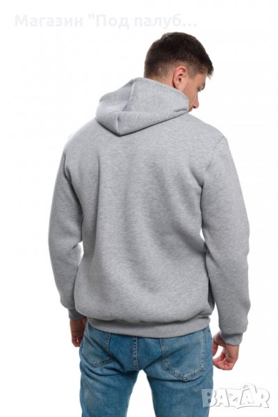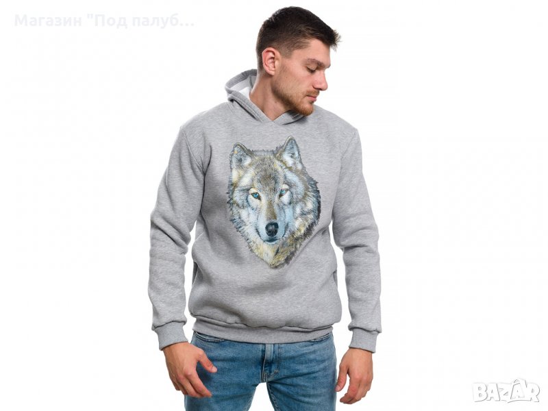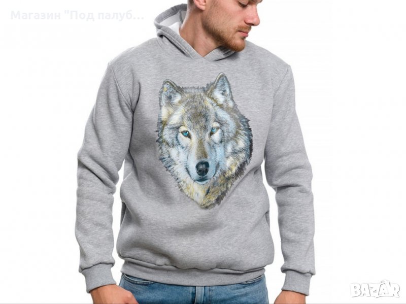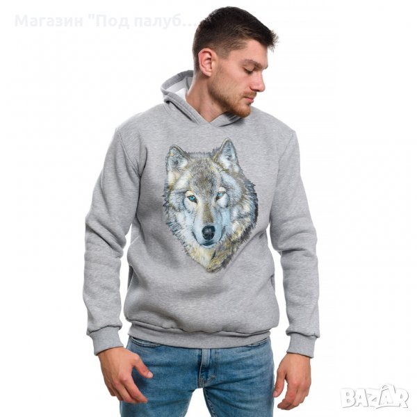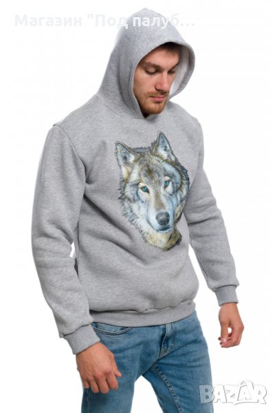 Нов мъжки суичър в сив цвят с качулка, две джобчета и трансферен печат Вълк със сини очи с размер 28х37см. Произведен в България под марката PRINTEX от висококачествен 100% памук - триконечна пенирана вата с кардировка, което го прави изключително топъл и желан от нашите дългогодишни клиенти. Моделът е подходящ за пролетния и есенно-зимният сезон, има ластични маншети на китките и ханша, запазващи топлината. Разполага с мека подплата и два отворени джоба в страни. Свободната кройка го прави подходящ както за спорт, така и за ежедневно носене с дънкови панталони. Марката PRINTEX от години се слави със своите топли и качествени суичъри.
