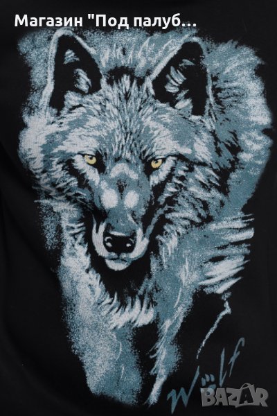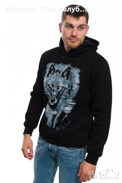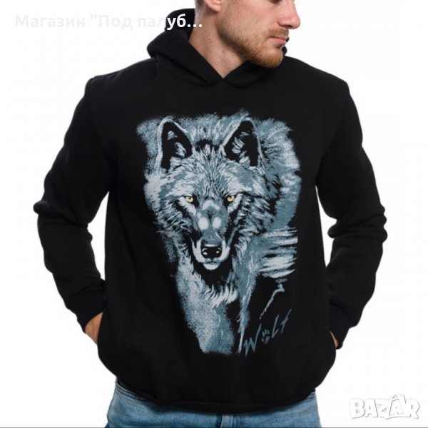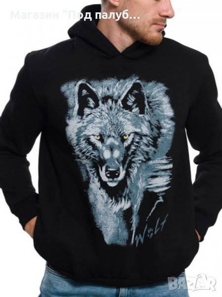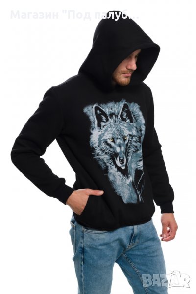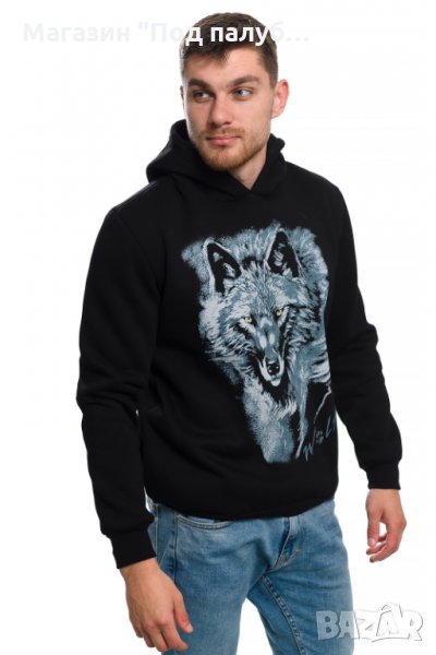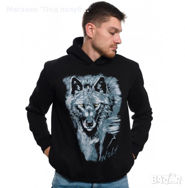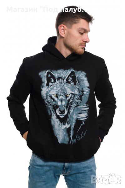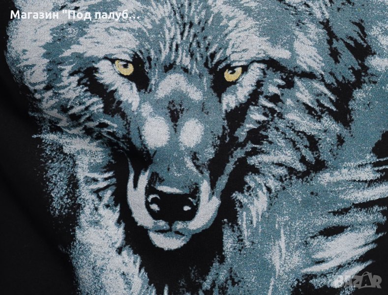 Страхотен нов мъжки суичър в черен цвят с качулка, две джобчета и дигитален печат Сив вълк с размер на печата 32х45см. Произведен в България под марката PRINTEX от висококачествен 100% памук - триконечна пенирана вата с кардировка, което го прави изключително топъл и желан от нашите дългогодишни клиенти. Моделът е подходящ за пролетния и есенно-зимният сезон, има ластични маншети на китките и ханша, запазващи топлината. Разполага с мека подплата и два отворени джоба в страни. Свободната кройка го прави подходящ както за спорт, така и за ежедневно носене с дънкови панталони. Марката PRINTEX от години се слави със своите топли и качествени суичъри.