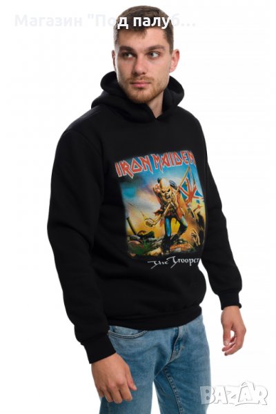 с качулка, две джобчета и дигитален печат на музикалната група IRON MAIDEN и тяхната песен The Trooper. Произведен в България от висококачествен 100% памук - триконечна пенирана вата с кардировка, което го прави изключително топъл и желан от нашите дългогодишни клиенти. Моделът е подходящ за пролетния и есенно-зимният сезон, има ластични маншети на китките и ханша, запазващи топлината. Разполага с мека подплата и два отворени джоба в страни. Свободната кройка го прави под