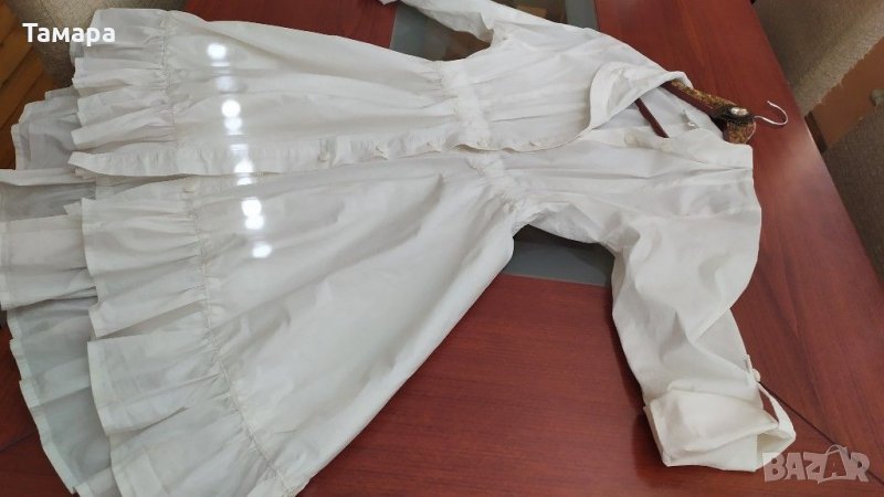 Бяла асиметрична риза-рокля от висококачествен памук с разкроена кройка.Носена два, три пъти.Отлично състояние.От кръста надолу плата е двоен,за да не прозира.Чудесна е:)