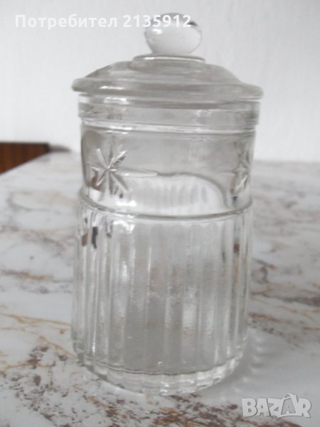 2.Неупотребявана захарница от дебело релефно стъкло с капаче, височина 10см, цена 5€
