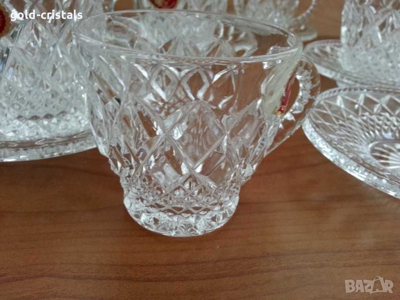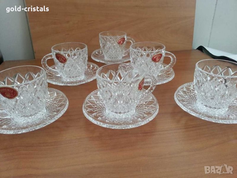 Кристален сервиз Бохемия чехословакия чаши за чай кафе с чинийки нови с етикет 6бр чинийки и 6бр чаши за кафе чай десерт сладолед и др комплект сет лот ретро арт декор винтидж колекция стари старинни антикварни предмети обзавеждане за дома и семейството подходящи за подарък за ценители и колекционери