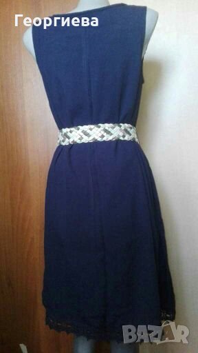 Чисто нова рокля с цялостна подплата и красива дантела, както в горната част, така и при подгъва.Кройкара е свободна, но може да се носи и с колан.Цената ѝ е ниска единствено, защото е без хартиен етикет!Фабрично е р-р 36(S), но е леко уголемена.Ето и подробните размери, взети едностранно: