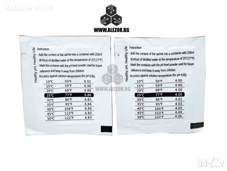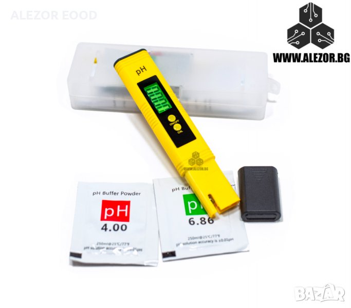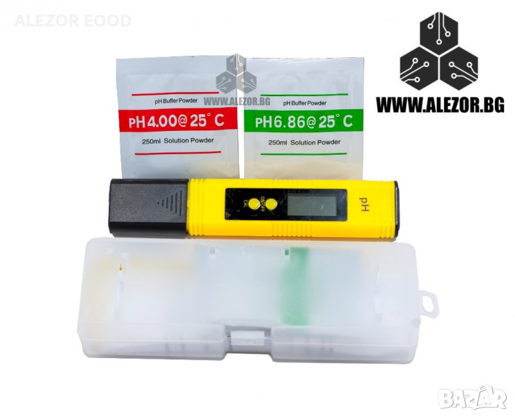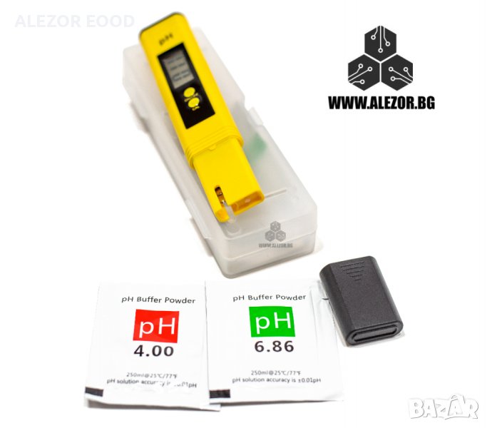 В комплекта са включени 2 бр. калибриращи разтвори, кутия, рН метър, инструкция на български език и батерии.