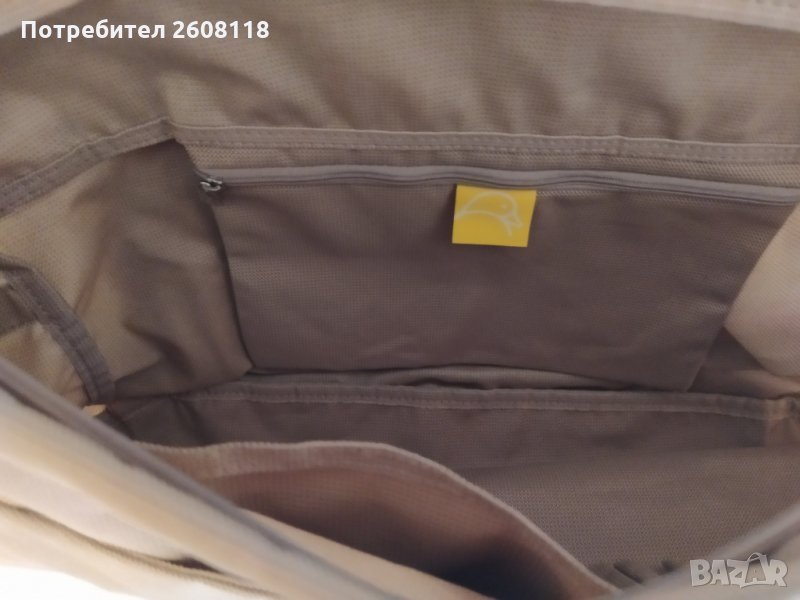 Регулируема презрамка, здрави работещи ципове с лого плъзгачи. Заден (към тялото голям джоб с цип), външен джоб (под капака на чантата), 2 вътрешни отделения, вътрешен джоб с цип, малки вътрешни джобове за телефон и др., общ голям цип под капака на чантата. Размери: 45/35 см (дъно 10/42 см)