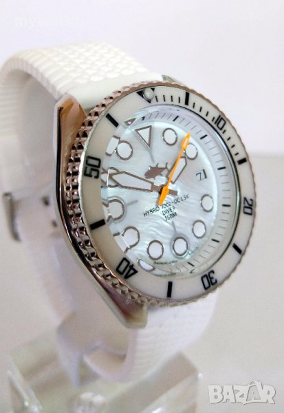 DragonShroud - Бяла перла (Седеф) „Tuna“ циферблат с нанесени часови маркери и Super LumiNova.TUNA символ на 12 часа. Това е "Stealth Tuna".