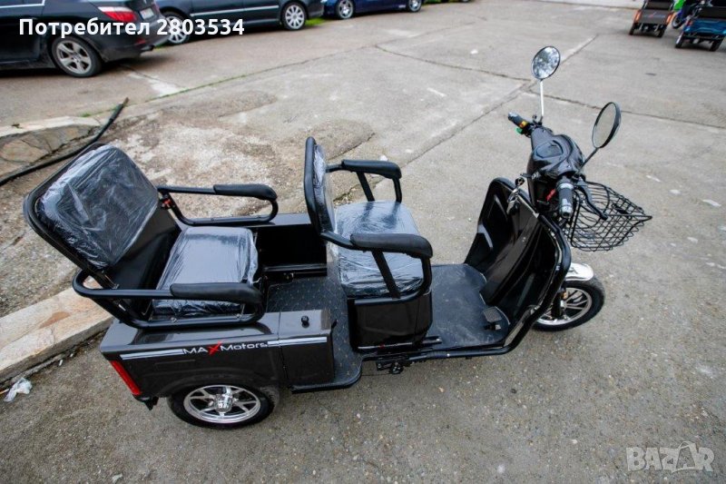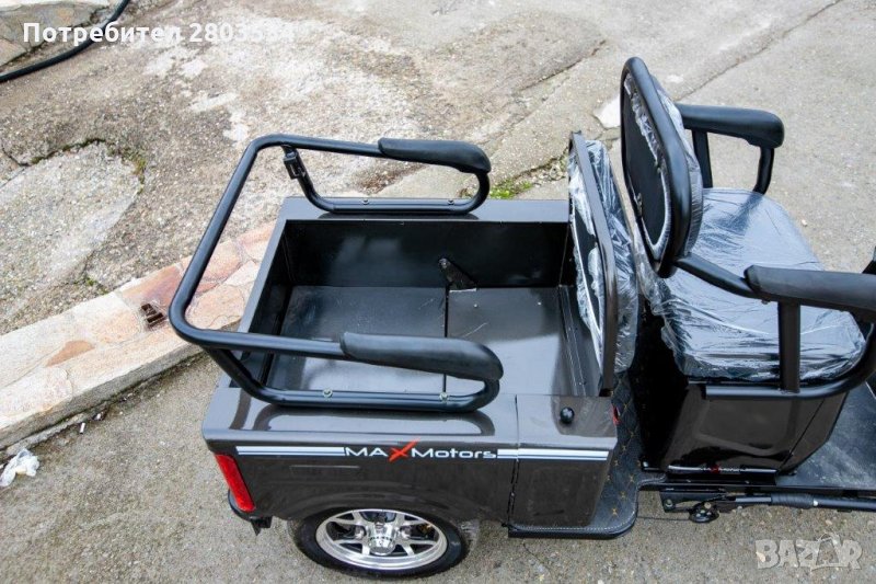 електрическа триколка Max Motors 1500W двуместна CARGO. Моделът е изключително атрактивен и подходящ за разходка на един или двама пътници.Задната седалка с едно движение се повдига и задната част се превръща в място за товар.Страничната част на задното отделение е със врата,което допълнително допринася за удобното пренасяне на товари.Последен модел на такъв тип триколки – нищо общо с предлаганите подобни на пазара.Изключително функционални, както за града, така и за по-малките населени места.