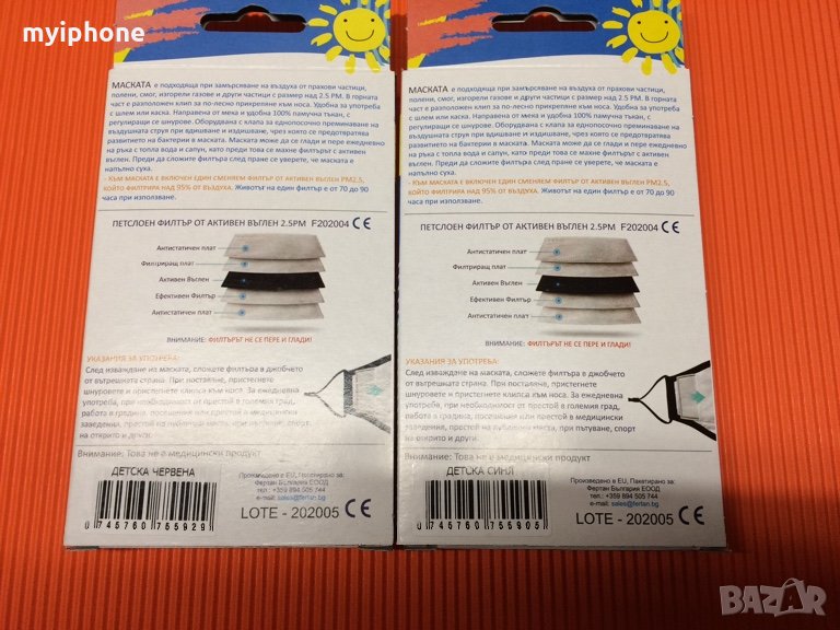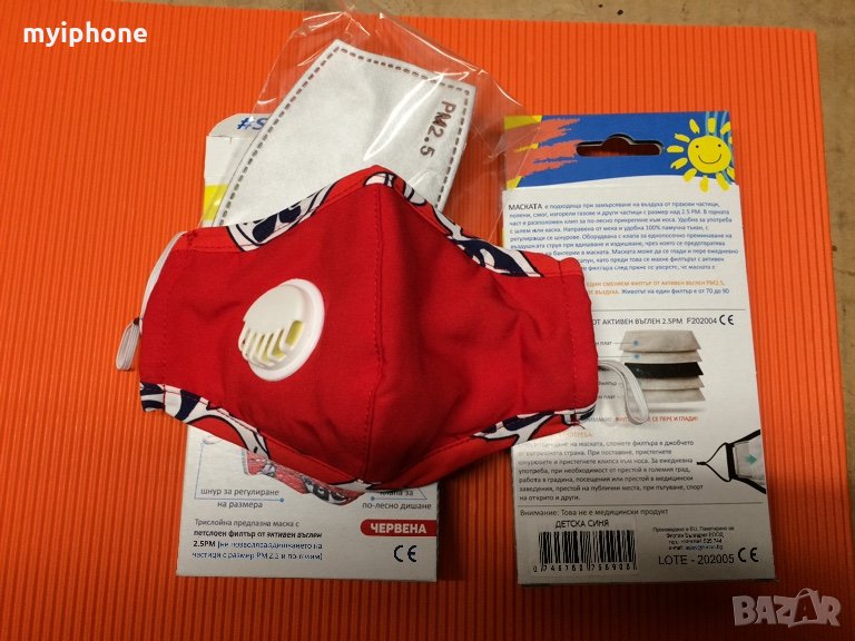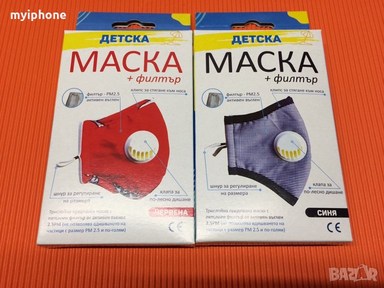 Детска предпазна маска произведена в България/ Защитен Комплект Маска за многократна употреба с клапа за по улеснено дишане ,подходяща за замърсяване на въздуха прахови частици,полени,смог,бактерии,вируси и др. В комплекта има включени памучна маска от 3 слоя с клапа и 3 Броя стандартен 5 слоен филтър с активен въглен РМ 2.5 ,маската има клипс около носа за плътно прилепяне на маската,както и регулиращи се ластици,маската обхваща и площа под брадата,маската може да се пере ежедневно на ръка с хладка вода и сапун,като преди това се махне филтъра и се пази сух и след като маската е напълно суха филтъра се връща на мястото му и може пак да се ползва, филтъра е предназначен за носене ежедневно до 8 часа или до две седмици в зависимост от интизитета на ползване,след това се сменява с нов филтър РМ 2. 5 Маските са произведени в България. Работим с Еконт 10 % Отстъпка от