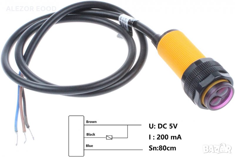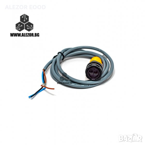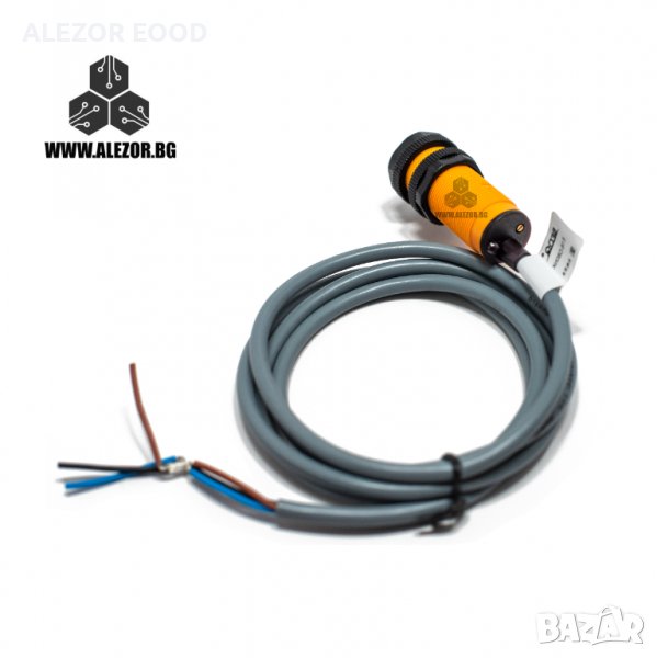 Оптоелектронен сензор с пластмасов корпус ф 18 x 60 mm, преход NPN, с един нормално отворен контакт, светодиодна индикация на работното състояние, възможност за ръчна настройка на работния обхват.