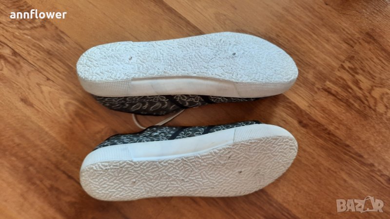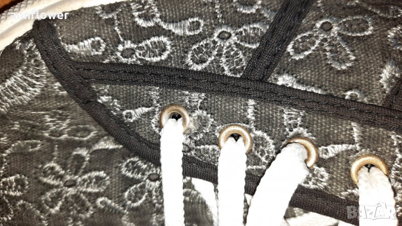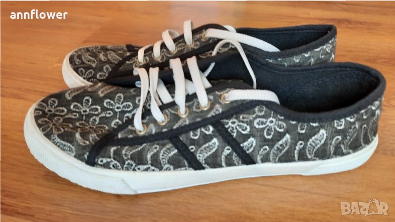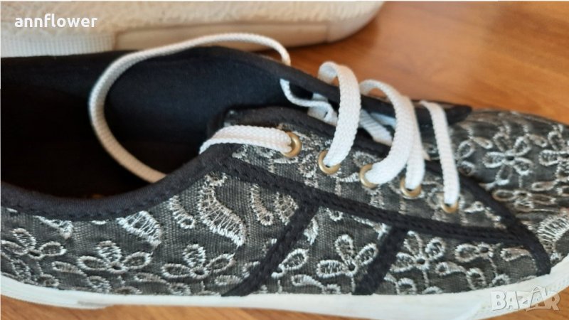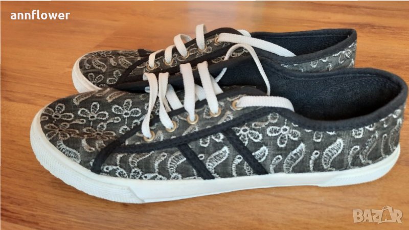 Кецове са нови и оригинални само са пробвани. Нямат кутия . Размер 41. Цвят графит със сиви бродирани цветя. Материя памучен текстил
