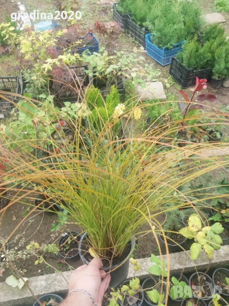 Описание: Mногогодишна вечнозелена трева. Образува късо и брадато коренище, туфата е гъста и компактна. Листата са тясно ланцетни до 40-50 см дълги и 8 мм широки, дъговидно извити, жилави с фино назъбен ръб. В средата имат широка жълта ивица, окантена с зелено. Цветът е метлица. Този вид карекс произхожда от Япония и е зимоустойчив за условията на България.