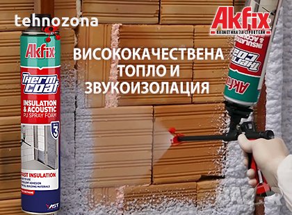 Полиуретанова пяна THERMCOAT Akfix се използва за висококачествена топлинна и шумоизолация на сгради,къщи, халета, офиси, гаражи, складове, фургони, каравани, кемпери и др. Тя осигурява добро, монолитно покриване на повърхността, без набраздяване и празнини.