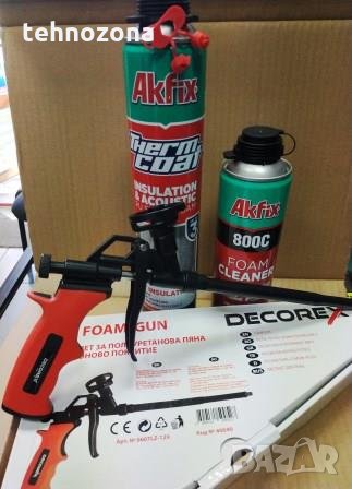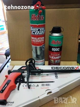 Пистолета за полиуретанова пяна е с тефлоново покритие, с ергономична дръжка и възможност за регулиране изходящото количество пяна. Може да се използва за полагане на всички видове еднокомпонентни пистолетни пяни. Препоръчително е след работа да се почиства с почистител за полиуретанова пяна AKFIX 800C. Клапанът в началото на пистолета контролира потока и пречи на пяната да се втвърди в дюзата. Тъй-като е възможно да регулирате потока на материала, пистолетът е подходящ за контролиране на струята и точно запълване на връзките, правейки го бързо, точно и безопасно да монтирате компоненти като врати и прозорци например. Позволява употребата на един и същи флакон за период от 3 седмици без пяната да се втвърди.