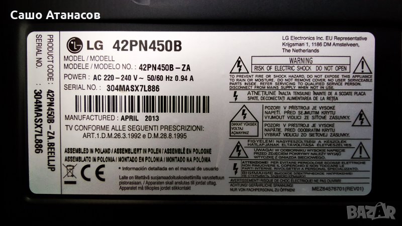 Работещ плазмен телевизор LG 42PN450B-ZA (панел PDP42T40010 )