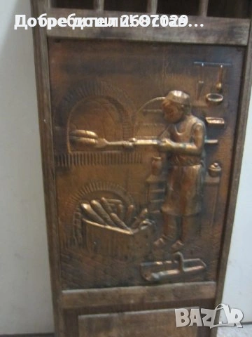 с медно пано отпред, отваря се отгоре, пантата е откачена, от масивно дърво. 1 бр.