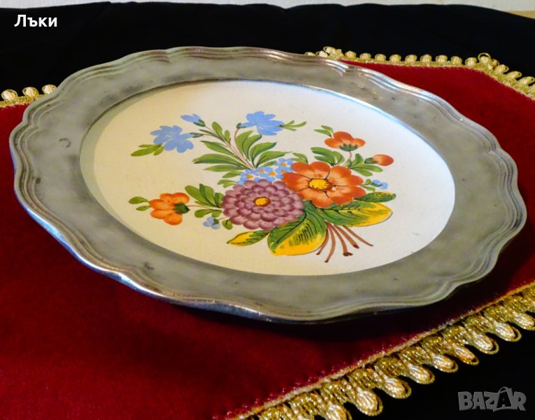 рисувана с пъстра картина на красив букет цветя.Порцелана е поставен в масивна рамка от 95% калай и 5% сребро.Диаметър 26 см.,височина 3 см.,тегло 1 кг.