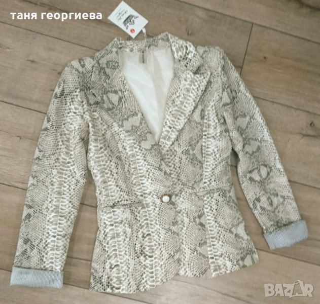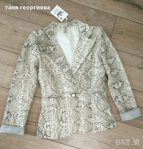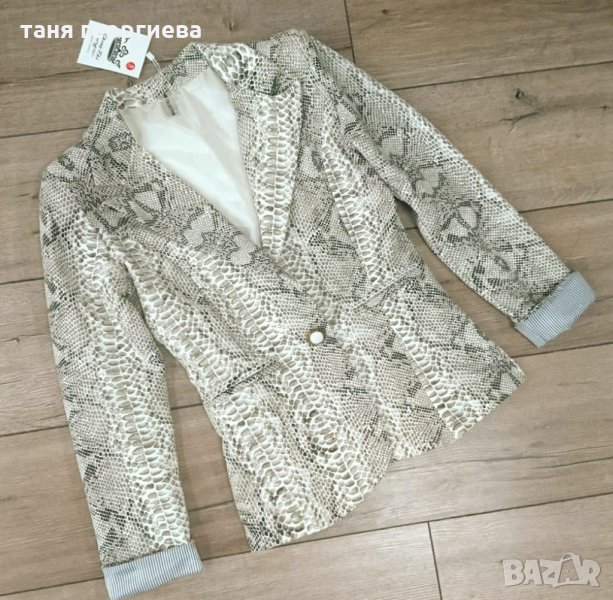 Ново уникално сако вталено на модерния за сезона питонов принт в бежовата гама