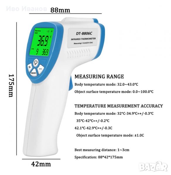 измерване: 32 C -42.5 C. Точност: 0.1C. Отклонение: 0.2 C. Ефективно разстояние