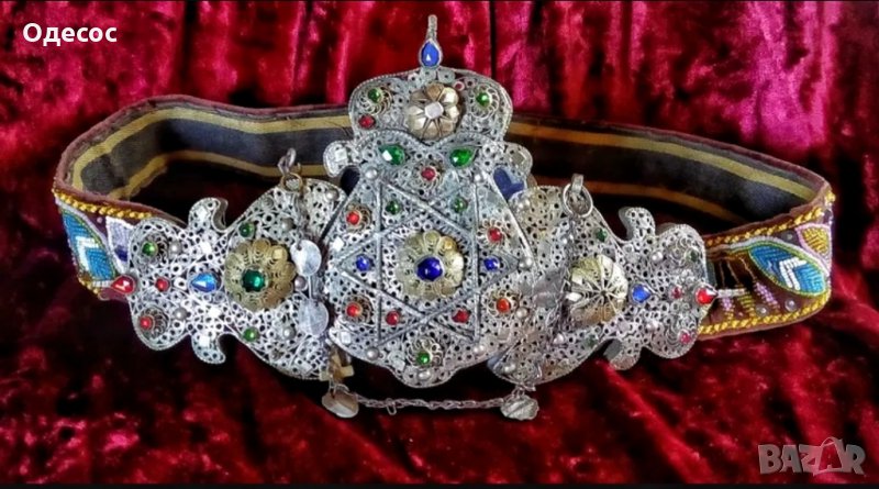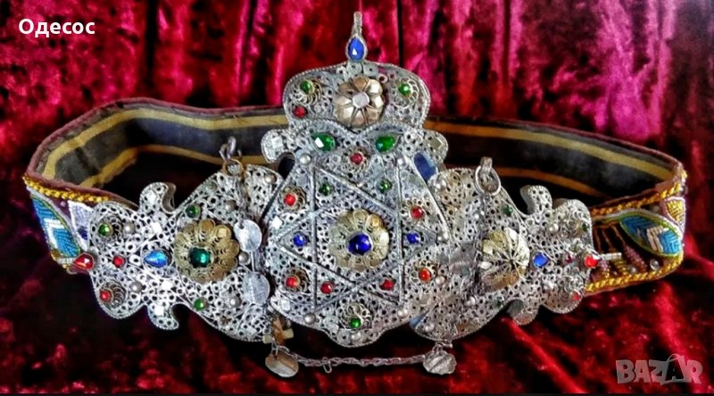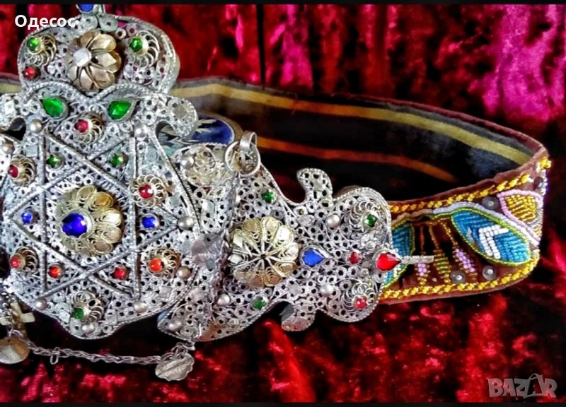 Уникални Възрожденски сребърни пафти изработени с техника филигран. В средата им е изобразена звездата на Давид. Целите са в камъни. Красив колан с мъниста. Размер на пафтите 27/14 см.