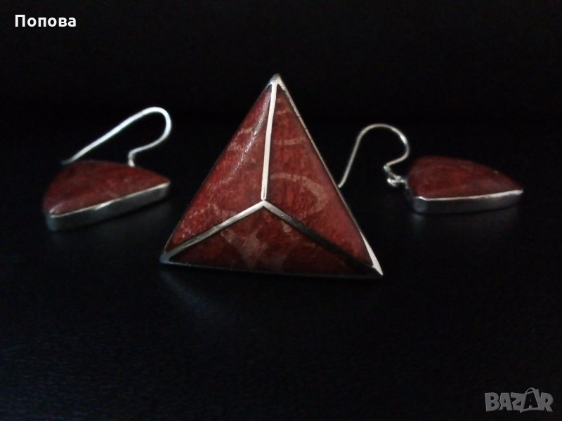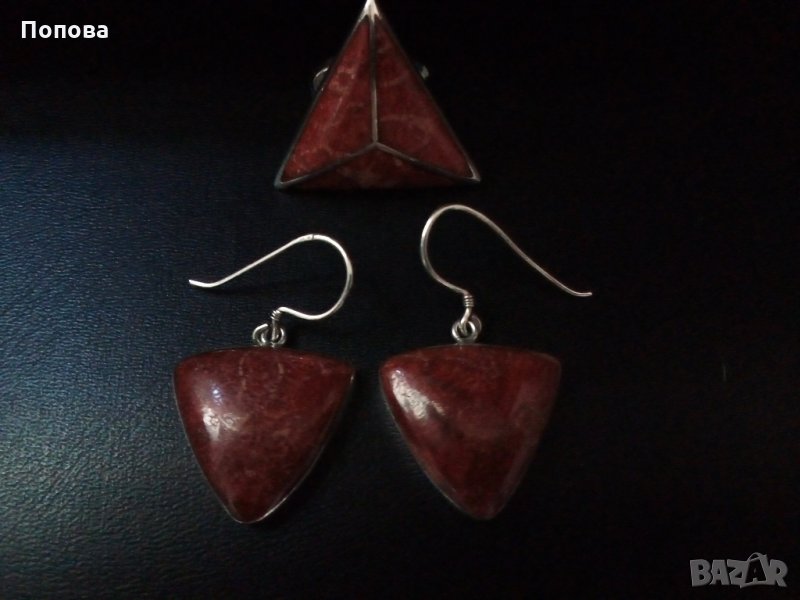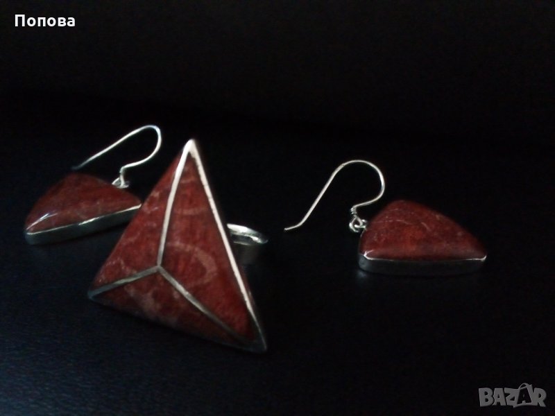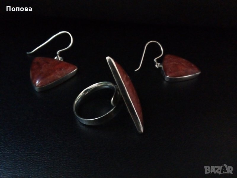 Уникален дизайнерски масивен сребърен комплект проба 925 с естествен корал.Перфектна ръчна изработка. Отворена халка на пръстена,универсален размер.Дължина на обеците заедно с куките 3,8 см.,височина на пръстена 3 см..Перфектно състояние. Цената е без коментар. Не ги деля.