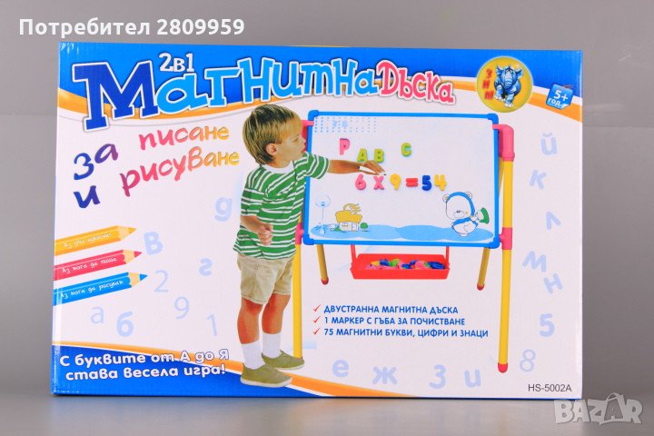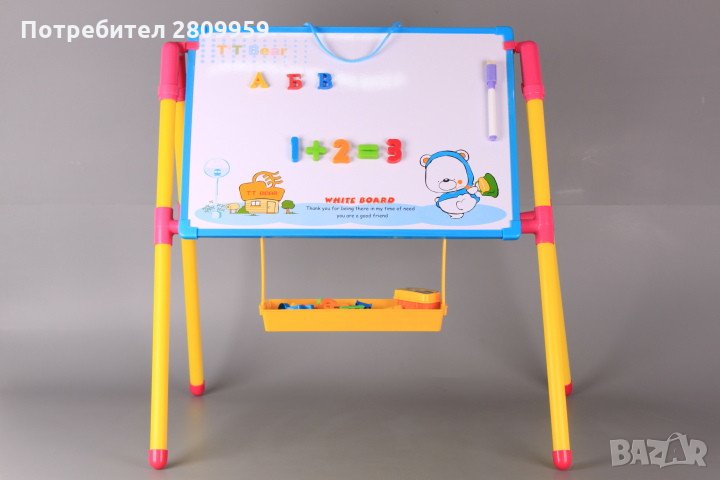 Комплектът съдържа магнитна дъска за писане, рисуване и подреждане на магнитни елементи, стойка за дъската, магнитни букви от българската азбука, магнитни цифри и математически символи, флумастер с изтриваща част, гъбка за изтриване, поставка за съхранение на елементите.Дъската е с две лица.Едната страна е магнитна, предназначена за нареждане на магнитните букви и елементи и също за писане и рисуване с флумастер.Другата страна е предназначена за писане и рисуване.Може да освободите дъската от стойката и да я окачите на стена.Размери на композицията със стойката-50*46*54 см.Размери на дъската без стойката-43*1*30 см.Височина на долния ръб на дъската, измерена от подовата повърхност-26 см. Възможни са различия в цветовете на елементите за свързване! За деца над 5 години.