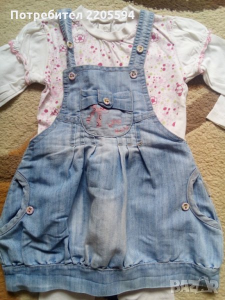 Дънкова рокличка във комплект със блузка,мака материя на целия комплект,модерна и много удобна.Чорапогащника е подарък към сета.Размер по етикет е 80см(1г.) но може да се носи по дълго защото презрамката се регулира от копченца.Без забележки!Цената е за целият лот!