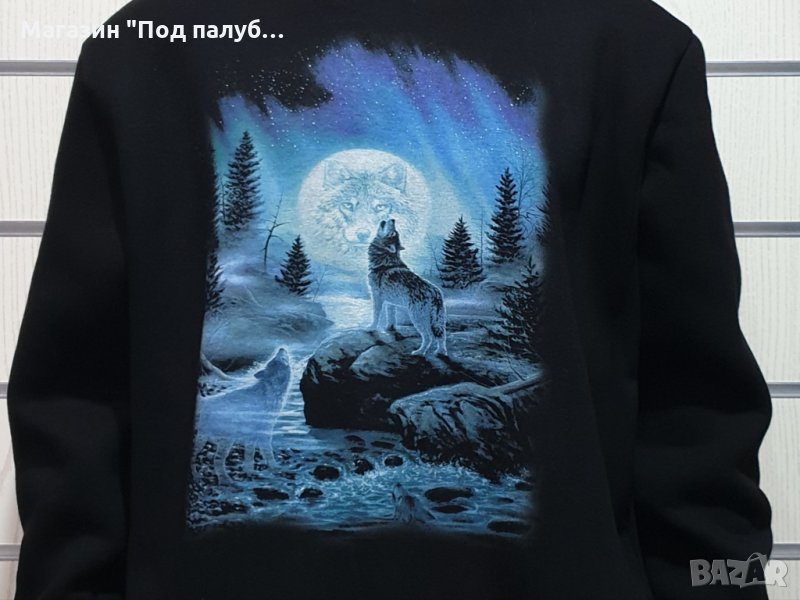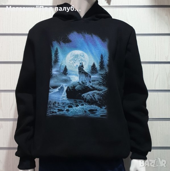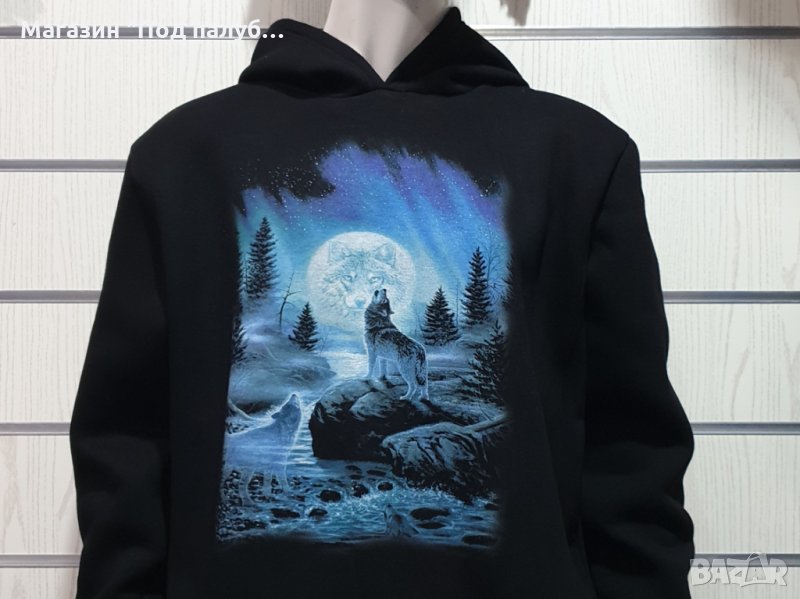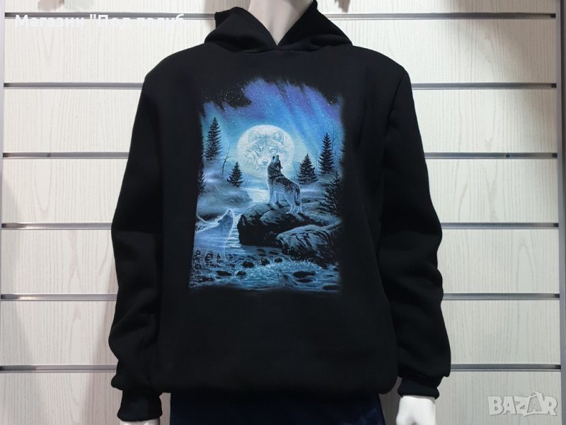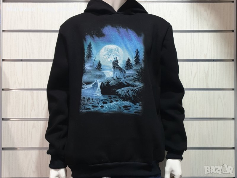Страхотен нов мъжки суичър в черен цвят с качулка, две джобчета и дигитален печат Вълк, пълнолуние. Произведен в България под марката PRINTEX от висококачествен 100% памук - триконечна пенирана вата с кардировка, което го прави изключително топъл и желан от нашите дългогодишни клиенти. Моделът е подходящ за пролетния и есенно-зимният сезон, има ластични маншети на китките и ханша, запазващи топлината. Разполага с мека подплата и два отворени джоба в страни. Свободната кройка го прави подходящ както за спорт, така и за ежедневно носене с дънкови панталони. Марката PRINTEX от години се слави със своите топли и качествени суичъри.