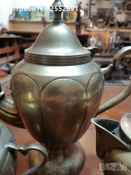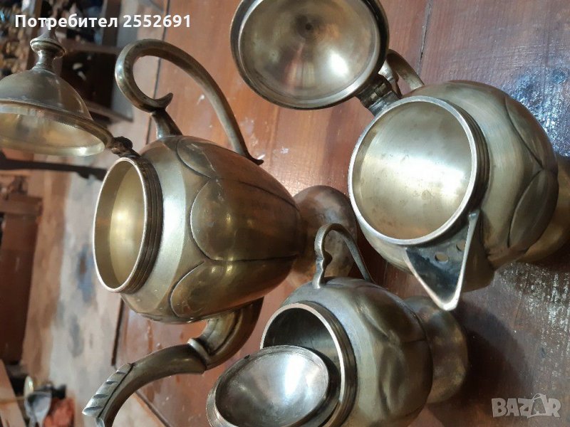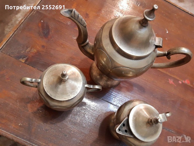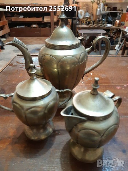 Комплект старинни месингови /бронзови /масивни кана,захарница и малка каничка . Височина на каната-22см. Височина на захарницата и малката каничка- по 15см. Цената е за комплекта.