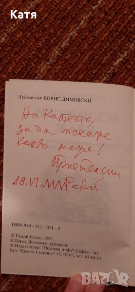 Подари ми я лично Радой Ралин преди 20 години. Написал ми е и няколко думи, вътре на първата страница. Леко скъсана предна корица. Така ми беше дадена.