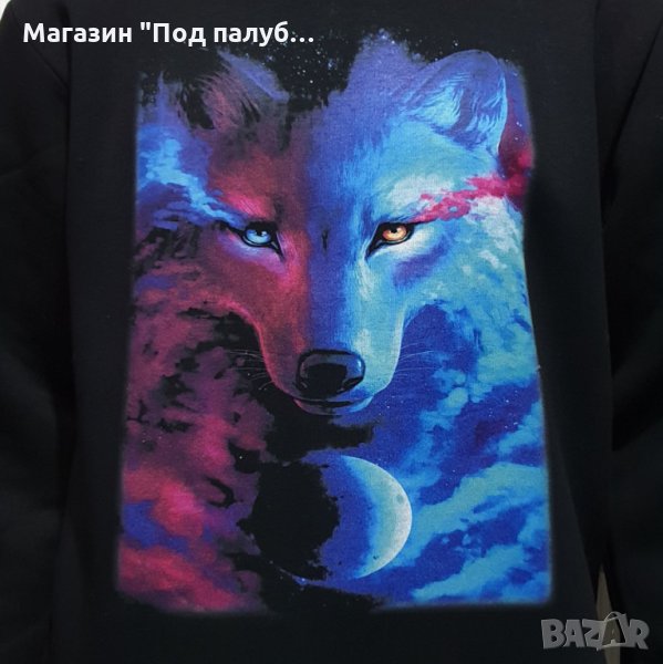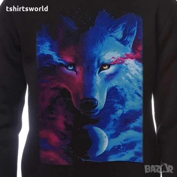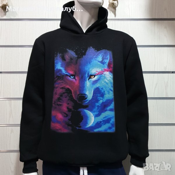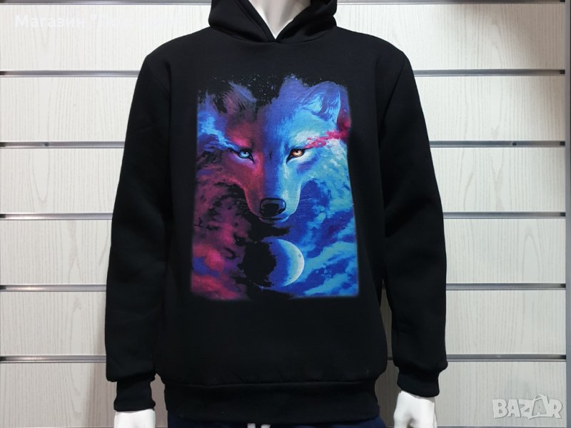 Страхотен нов мъжки суичър в черен цвят с качулка, две джобчета и дигитален печат Вълк, GALAXY WOLF, пълнолуние. Произведен в България под марката PRINTEX от висококачествен 100% памук - триконечна пенирана вата с кардировка, което го прави изключително топъл и желан от нашите дългогодишни клиенти. Моделът е подходящ за пролетния и есенно-зимният сезон, има ластични маншети на китките и ханша, запазващи топлината. Разполага с мека подплата и два отворени джоба в страни. Свободната кройка го прави подходящ както за спорт, така и за ежедневно носене с дънкови панталони. Марката PRINTEX от години се слави със своите топли и качествени суичъри.
