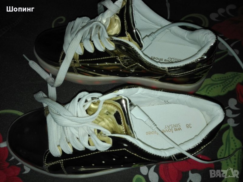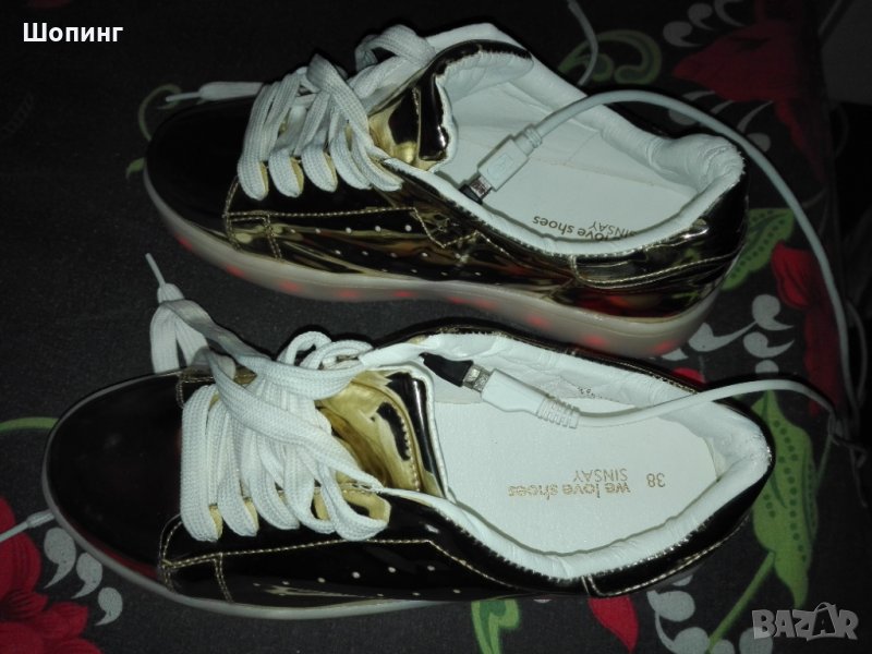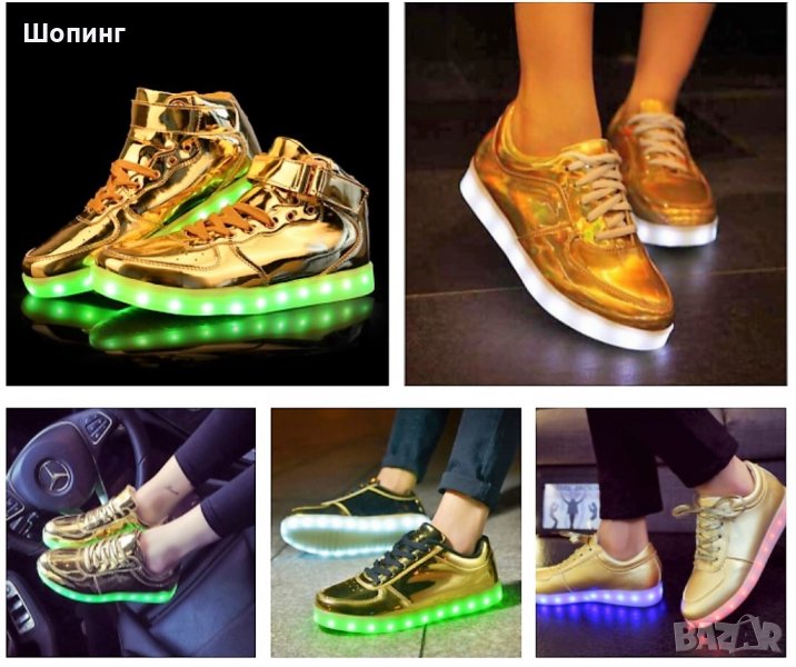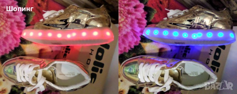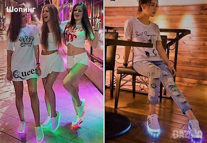 LED подсветка, осигурена от светодиодите, интегрирани в подметката. Светят в 7 неонови цвята, комбинирани в 6 различни програми. Може да мигат, да светят постоянно в избран от вас цвят. Превключването на отделните програми се извършва много лесно по всяко време чрез копче, което е вградено от вътрешната страна на обувките. Батерията се зарежда със стандартен USB кабел и издържа 3 часа. Светлинната система е напълно безопасна. Препоръчително е да не се носят в дъжд и сняг.
