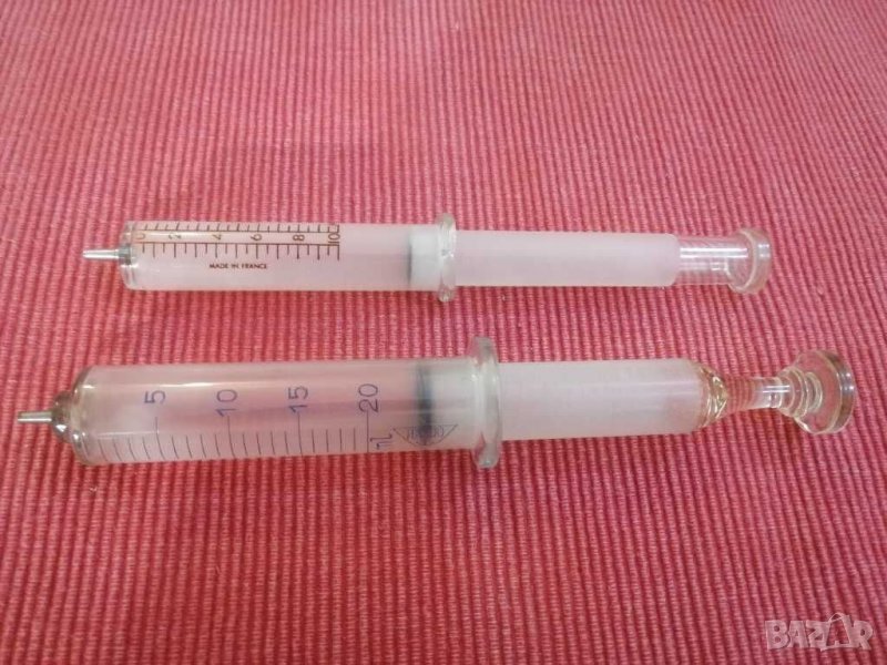 Два броя стари стъклени спринцовки в отлично състояние. Спринцовките са изцяло от стъкло.