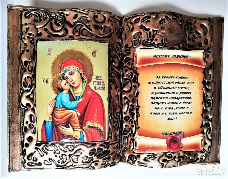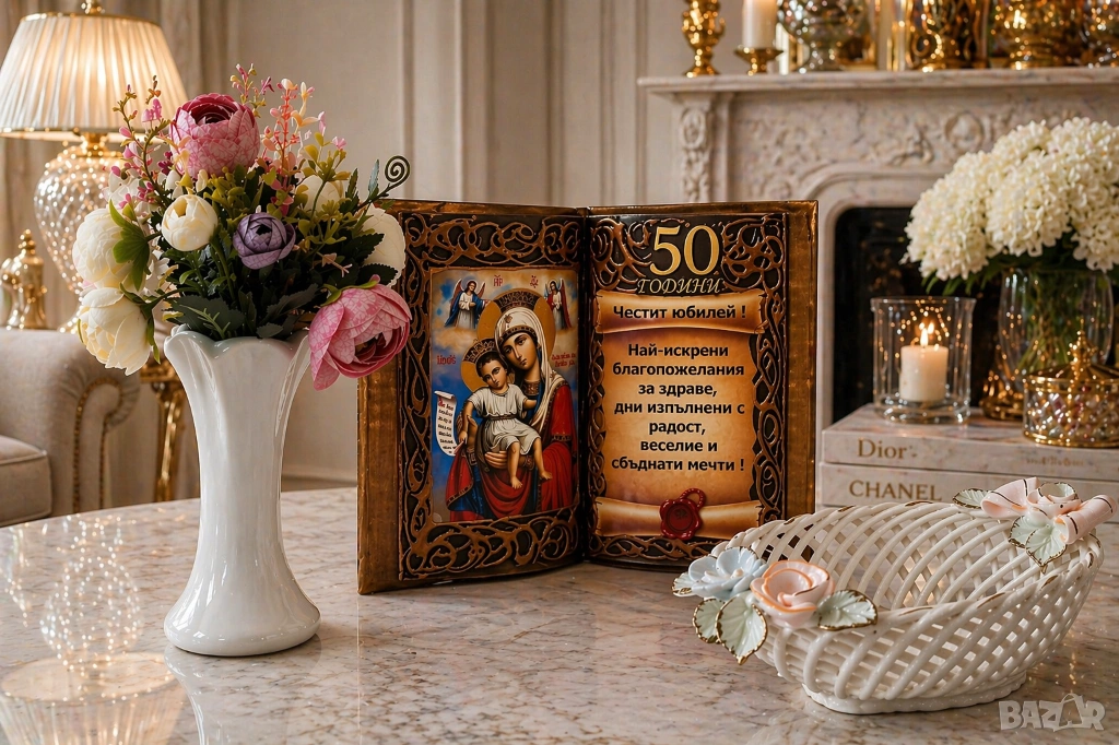 Ръчно изработена, авторска книга - икона с Богородица с пожелание за юбилей .