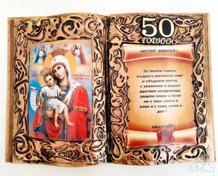 Оригинален, авторски комплект, книга - икона и декорирана с кожа /пълна/ бутилка със златни цифри и плочка с пожелание за юбилей 50 години и кръгли годишнини 60, 70, 75 и 80 години.