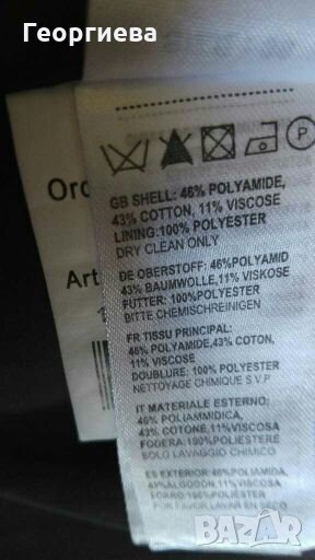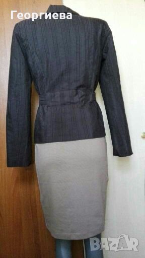 Ново, без хартиен етикет.Платът е смесена материя, като в състава ѝ има 43% памук.Дрехата е много елегантна и представителна!Цветът е като на снимките, като има луксозна лъскавина.Сакото е идеално за повод, или за офис!Роклята от снимките е идеална в комбинация със сакото - също нова, с еластичност и от памук.