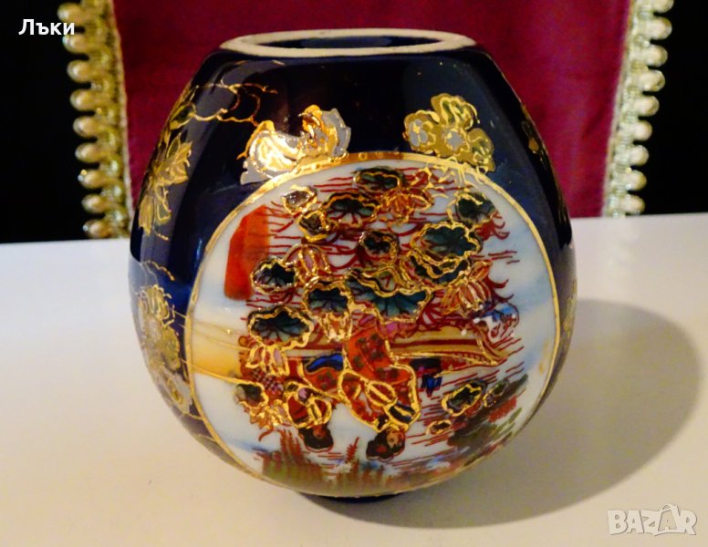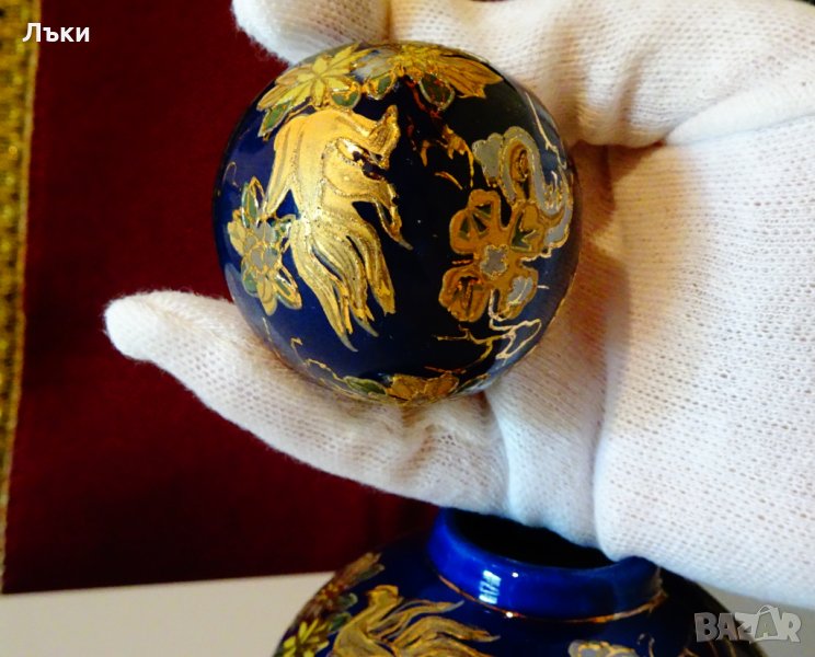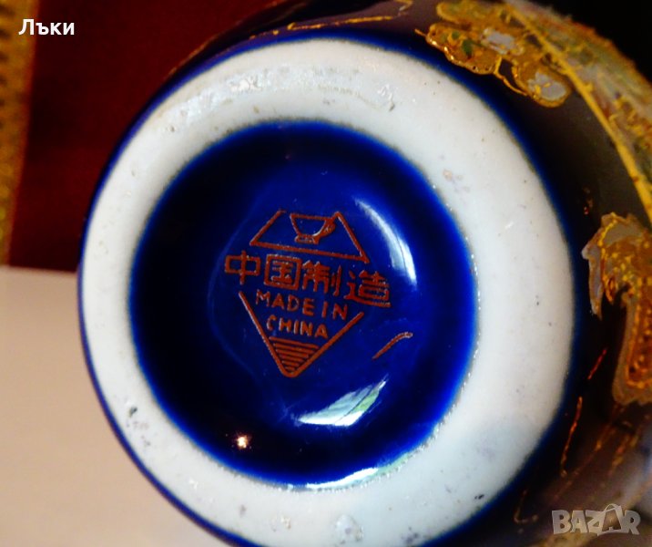 злато 24 карата.Двете картини са със златна рамка на блестящи златни топчета.От страни на мастилено син фон от кобалт лети Феникс от злато,оставя златни огнени дири и златни цветя.Вазата е маркирана Zhonghua Zhen Pin Китай,производство