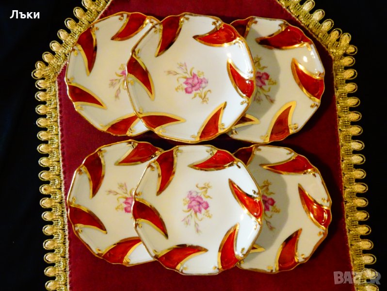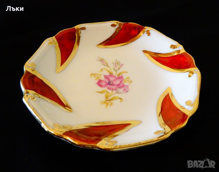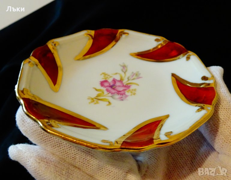 Старинна чиния,купичка,баварски костен порцелан,маркирана.Ръчно декорирана с цветя,червен рубин и дебело 24 карата златно покритие.Порцелана има нежен релеф.Височина 1.5 см.,диаметър 11