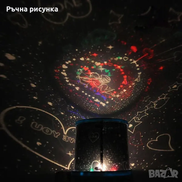 Нощна лампа - проектор с Купидон и сърца /на батерии или с USB кабел/.Нощна лампа - проектор с Купидон и сърца, създава романтична обстановка. Лека и компактна с опростен дизай.
