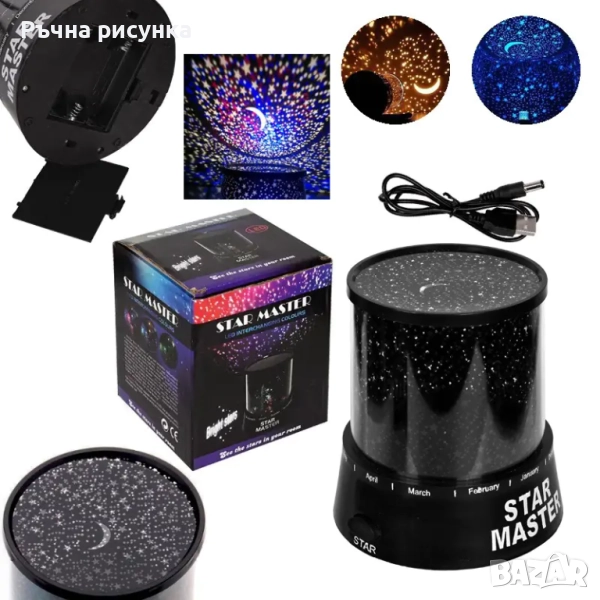 Нощна лампа - проектор с Луна и Звезди, създава звездна обстановка. Лека и компактна с опростен дизай.