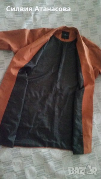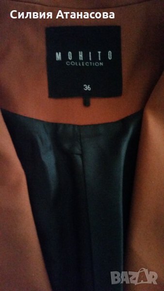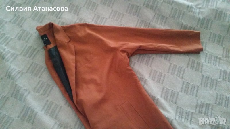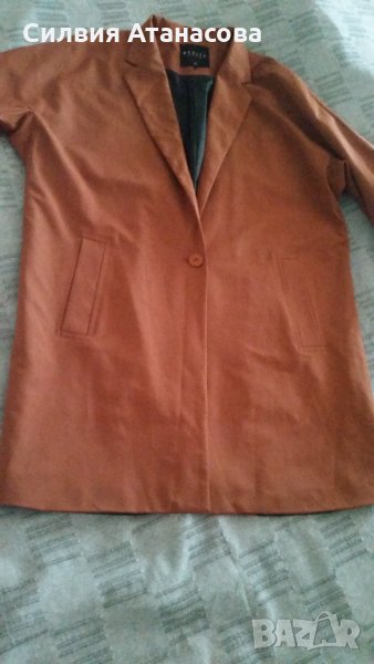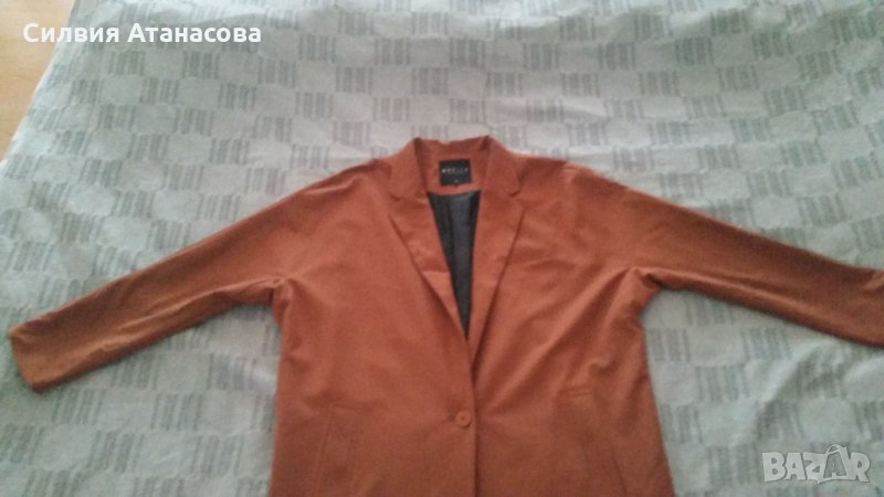 Дамско дълго сако Mohito в тъмно оранжев цвят, размер 36, за S/M, 60% полиестер, 32% вискоза и 8% еластан, с реглан ръкав, ново, без никакви забележки. Дължина от раменете 85см, ширина при гърдите 55см, надолу към талията 53см, и най-долу 51см, измерени откъм гърба. Сакото стои в горната част по- широко от реглан ръкавите и надолу се стеснява, закопчава се с 1 копче.