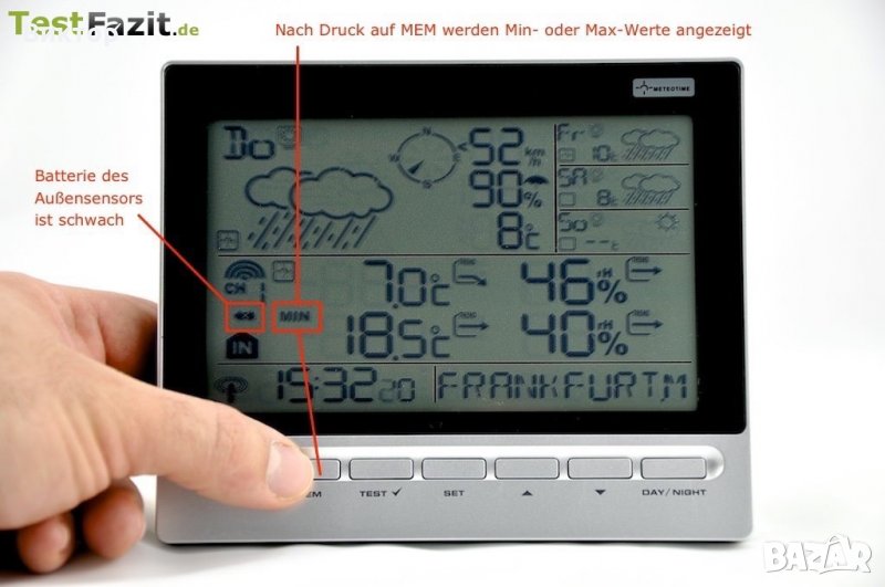Както при почти всички метеорологични станции, стартирането на Conrad Meteotime е доста лесно. Първо батериите се вкарват в предавателя и след това в базовата станция. Тогава стойностите на измерените температури се показват много бързо на дисплея. Връзката с външния сензор винаги е работила без проблеми при теста. След известно време се показват стойностите за час, дата и прогноза на данните за времето.
