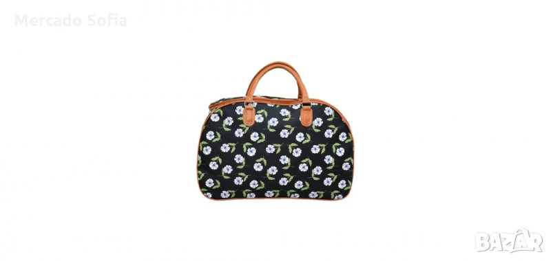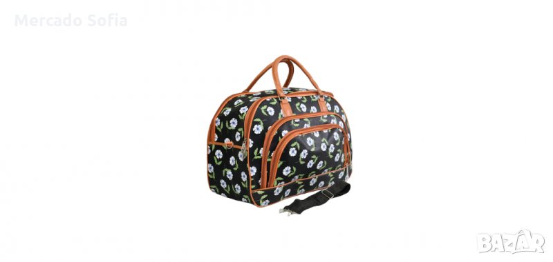 Пътна чанта от еко кожа , цвят черен със щампирани цветя , размер 52/33/22 см , удобна и практична , с едно основно отделение , затваря се с цял голям капак и двупосочен цип , има два джоба отпред , две фиксирани дръжки и отделна регулируема за рамо.