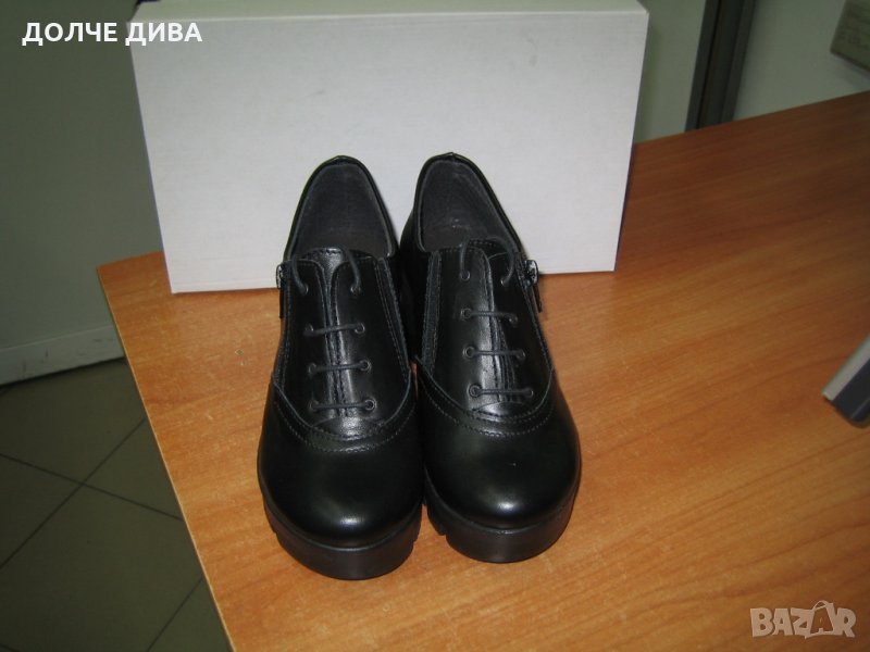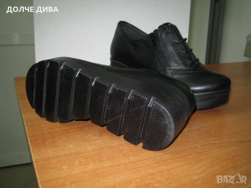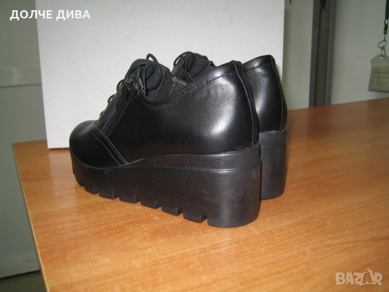 Удобни дамски обувки от качествена мека черна естествена кожа с естествен хастар и ест. стелка с цип и връзки на лека и удобна платформа с височина отзад-6,5см. и отпред-3см. Българско производство! За доп. информация-пишете или позвънете!