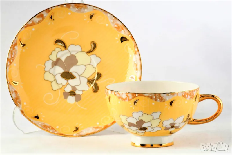 Комплект чаши с чинийки от висококачествен костен порцелан и ръбчета със злато .