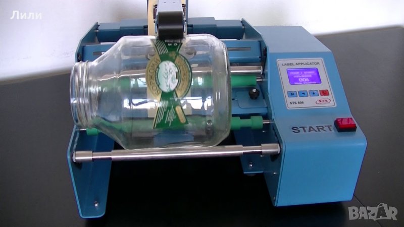 Машината е предназначена за залепване на 1 или 2 самозалепващи се етикети върху цилиндрични бутилки и съдове (пластмаса, стъкло и други).