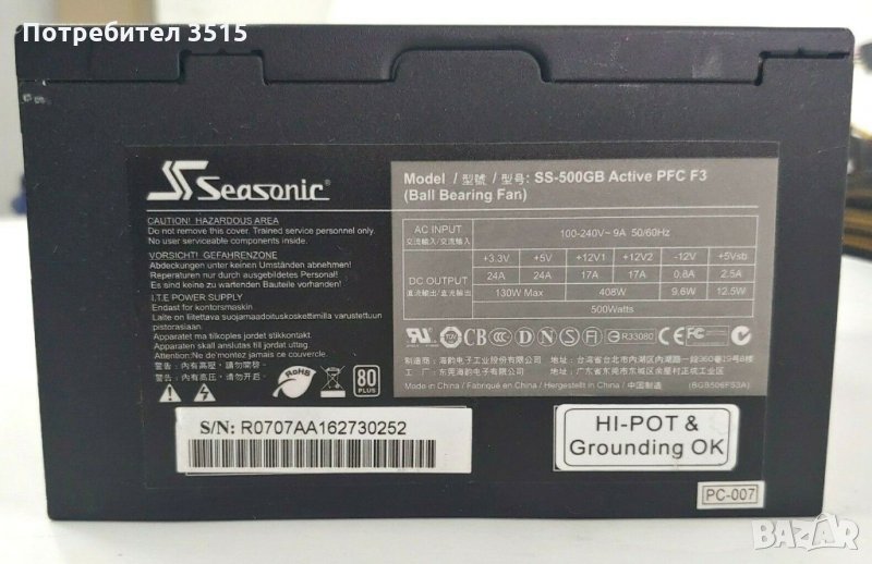 Захранване Seasonic S12ii SS-500GB Active PFC F3 Power Supply PSU 500W ATX