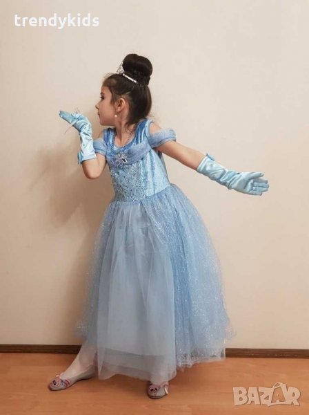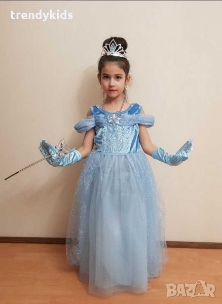 НОВА ЛУКС Приказна- разкошна рокля на Пепеляшка или на Ледената кралица . Горната част е изработена от еластично кадифе, около раменете с богат пласт прозрачно-син тюл, на гърдите има кристална снежинка. Полата е бухнала с пластове тюл и шифон! По желание могат да се поставят пеперуди на нея. Включени са към роклята.