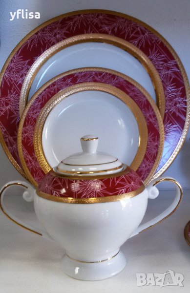 Красив и качествен сервиз с гравирани златни кантове от иновативен, фин порцелан Y o L i S a, който се използва в миялна машина без изтъркване / падане на гравираните, златните кантове !