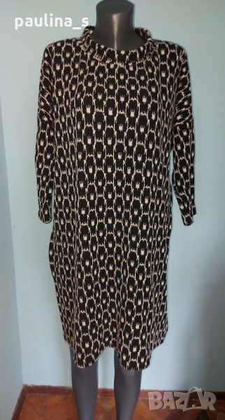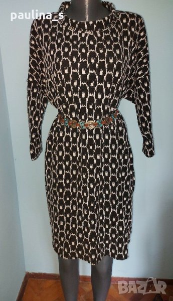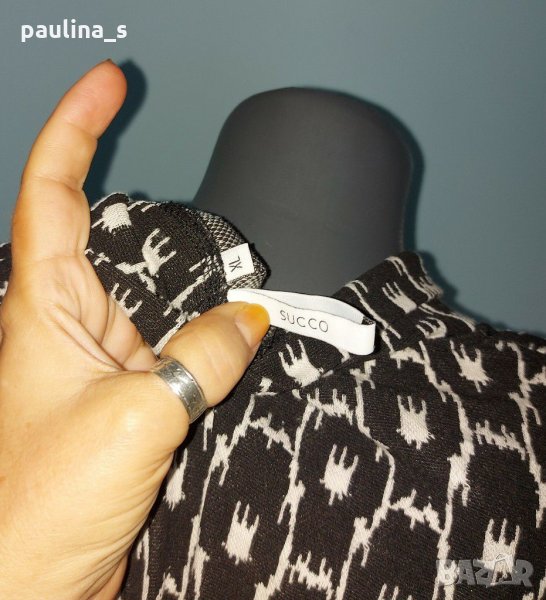 1. Колаж / L / 2XL - "Succo". Цената е крайна 24,99лв. Еластична брандова рокля тип туника с падащи рамене до над лактите. Материята е плътна ликра и полиестер, много еластична и покрива няколко размера. Моделът е прав с ръкави до лактите, от тях нагоре е роклята, коланът е примерен (сребрист с оксидирани елементи и естествени тюркоази) - цена 12,99лв.